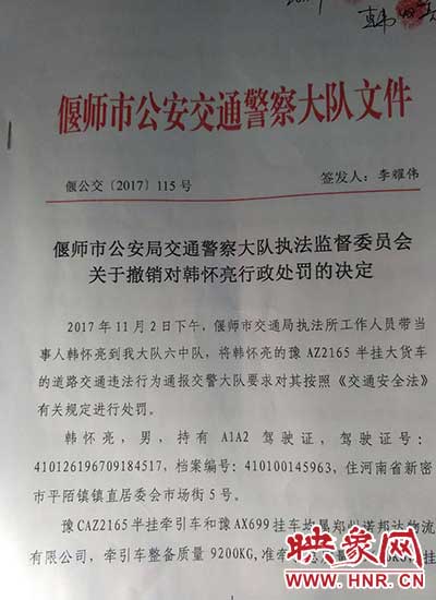 17日下午13時許,在廣電南路上,法制科黎科長和督察李警官帶著“偃師市公安局交警大隊(duì)執(zhí)法監(jiān)督委員會關(guān)于撤銷對韓懷亮行政處罰的決定”文件與韓先生見面。