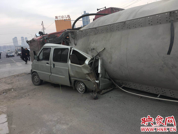 22日上午9時(shí)30分左右,江山路與新苑路交叉口東北角,車牌號為豫EX115掛的槽罐車仍然壓在車牌號豫AA817Y的面包車上。槽罐車上裝有40多噸散裝水泥,另一輛趕來救援的槽罐車正在將事故車內(nèi)的水泥轉(zhuǎn)移出來。救援的槽罐車司機(jī)說,事故發(fā)生時(shí),槽罐車沿江山路由南向北行駛,走到與新苑路交叉口時(shí),面包車沿江山路由北向東左拐。事故路口沒有紅綠燈,大車司機(jī)看到面包車后,立即向右打方向,躲避面包車。由于離心力作用,大車向左側(cè)翻,壓在面包車上,將面包車四分之三壓扁,僅剩駕駛室位置。