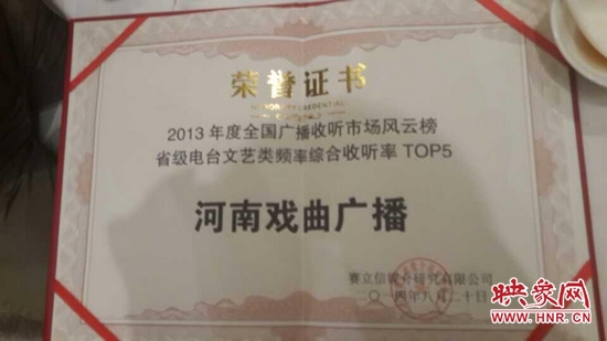 2014年8月20日晚上,國內(nèi)知名廣播收聽率調(diào)查公司賽立信媒介研究有限公司在成都舉行發(fā)布會(huì),授予河南電臺(tái)戲曲廣播娛樂976“2013年度全國廣播收聽率TOP5”榮譽(yù)稱號。