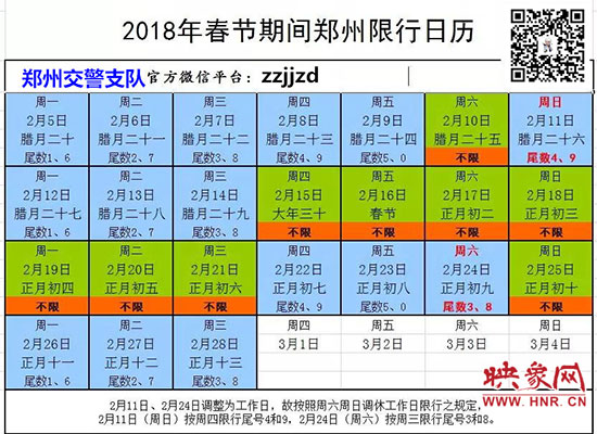 映象網(wǎng)訊(記者 秦雯)2018年春節(jié)長(zhǎng)假?gòu)?月15日開(kāi)始至2月21日結(jié)束,共7天,春節(jié)將至,為了確保在市民人流、車(chē)流、物流最密集的時(shí)段可以安全出行。2月5日,記者從鄭州市交警支隊(duì)了解到:2月15日至2月21日春節(jié)七天長(zhǎng)假期間,鄭州市區(qū)三環(huán)以內(nèi)所有機(jī)動(dòng)車(chē)尾號(hào)不限行,但2月11日(星期日)、2月24日(星期六)上班,因法定節(jié)假日放假調(diào)休而調(diào)整為上班的周六、周日,按對(duì)應(yīng)調(diào)休的工作日限行,因此2月11日(周日)按周四限行規(guī)定,限行尾號(hào)4和9;2月24日(周六)按周三限行規(guī)定,限行尾號(hào)3和8。
