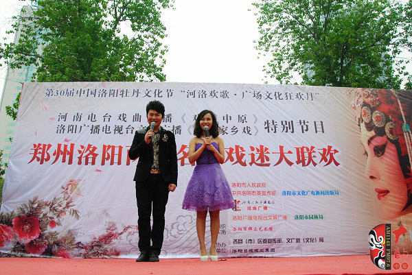 4月17日上午,在位于洛陽市中心、以體現(xiàn)周朝文化為主題的周王城廣場,“周公營建洛邑”雕塑旁,主辦方舉辦了一場別開生面的戲曲演唱會(huì)。來自鄭州、洛陽兩地的豫劇名家張?jiān)聵s、曾廣蘭、趙曉梅、王藝紅,著名演員徐俊霞、陳大華、劉亞林、曲韻、劉海功、沈萍,梨園春明星擂主張艷紅、謝憲笙等為來自全省各地的戲曲廣播《戲迷俱樂部》百余位戲迷和現(xiàn)場的廣大觀眾奉獻(xiàn)了精彩的戲曲唱段。藝術(shù)家們演唱的《洛陽橋》、《秦雪梅》、《七品芝麻官》、《對花槍》、《拷紅》、《收姜維》、《朝陽溝》、《倒霉大叔的婚事》、《小白鞋說媒》、《紅菊》等不同劇種、不同流派、不同行當(dāng)?shù)哪捴巳丝诘某?,博得觀眾一陣又一陣的掌聲,河南戲曲廣播主持人媛媛、李鋮表演的雙簧妙趣橫生,引得觀眾樂不可支。