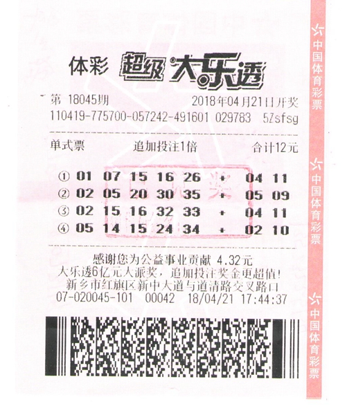 張先生這張中獎(jiǎng)的彩票上,共有四注,屬單式追加投注,票面金額12元。據(jù)張先生介紹,前兩注是他從體彩銷售網(wǎng)點(diǎn)推薦的號(hào)碼中選出的,后兩注是他長(zhǎng)期守號(hào)的號(hào)碼,這次是第二注讓他幸運(yùn)的斬獲大獎(jiǎng)!