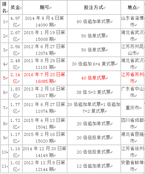 數(shù)據(jù)顯示,江蘇省41注頭獎(含1注追加)出自蘇州市第3205005209101體彩投注站,其中一張中獎彩票中得40注頭獎,該中獎票為一張單式票,進(jìn)行了40倍投注,投注共計(jì)80元,該票累計(jì)中獎2.14億元。為今年體彩大樂透開出的第1個億元大獎。