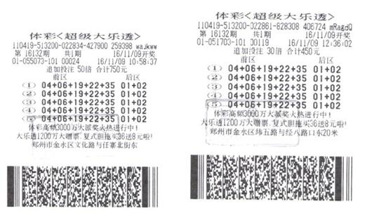 彩民在鄭州東區(qū)體彩分中心兌獎(jiǎng)的兩張彩票--- 60倍