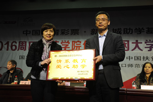 2016年12月7日、8日,中國(guó)體育彩票品牌公益項(xiàng)目“中國(guó)體育彩票新長(zhǎng)城助學(xué)基金”2016年捐贈(zèng)儀式分別在商丘師范學(xué)院和周口師范學(xué)院舉行。據(jù)悉,通過(guò)此次捐贈(zèng)活動(dòng),河南省體育彩票管理中心共向兩個(gè)學(xué)校來(lái)自全國(guó)14省區(qū)的120名優(yōu)秀貧困大學(xué)生每人捐助5000元,幫助他們和他們的家庭,減輕學(xué)習(xí)生活中的經(jīng)濟(jì)負(fù)擔(dān)。