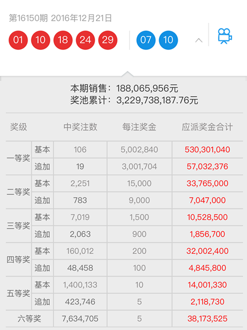 北京時(shí)間2016年12月21日晚,體彩大樂(lè)透第16150期開獎(jiǎng),開獎(jiǎng)號(hào)碼前區(qū)為“01、10、18、24、29”,后區(qū)開獎(jiǎng)號(hào)碼為“07、10”。河南彩民喜獲4注頭獎(jiǎng),其中1注追加頭獎(jiǎng),分別出自:鄭州(基本2注)、開封(基本1注)、三門峽(基本1注追加1注)。