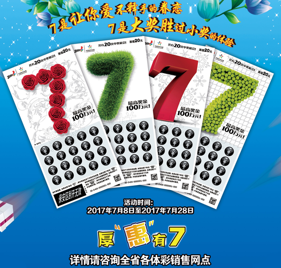 體驗(yàn)頂呱刮新票“7”,新感覺贏大獎(jiǎng),樂在“7”中;邂逅在最美的季節(jié),購新票拿好禮,“7”樂無窮!