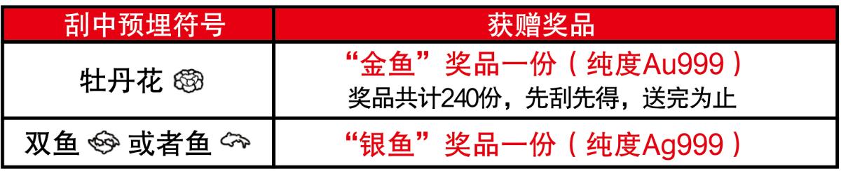 活動期間,彩民在我省任一體彩銷售網點購買30元面值“富貴有余”主題即開票,若單張彩票刮出符合獎勵條件的預埋符號,并經兌獎設備(IVT或BCR等)完成掃描確認(促銷兌獎)且剪角處理后,即可獲贈精美獎品一份,詳見下表: