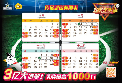 根據(jù)9月-12月的足彩競猜場次安排,各周末獎期受注賽事均以歐洲五大聯(lián)賽為主,其中9月份14場勝平負游戲和任選9場游戲的指定派獎期為第17134期、17135期、17139期、17140期、17144期、17145期(10月1日停售)。也就是說,未來連續(xù)3個周末獎期均有派獎。今年10月2日-8日、11月6日-12日兩周是國際比賽日,周末五大聯(lián)賽將暫停,預(yù)計將指定當周中獎期派獎,受注賽事為各大洲世界杯預(yù)選賽及部分國家隊友誼賽。