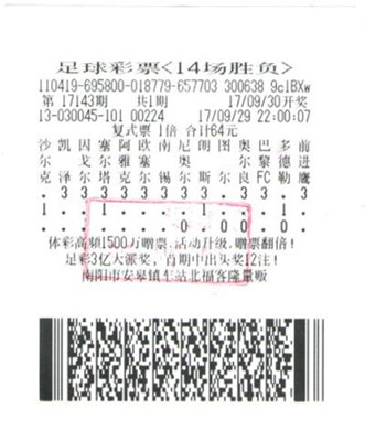南陽年輕彩民中足球彩票(14場勝負)46萬余元