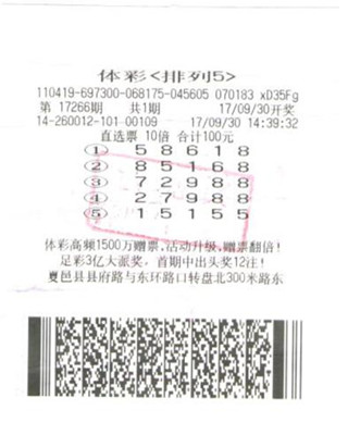 商丘老彩民中排列五100萬元