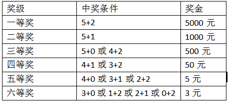 一等獎(jiǎng):投注號碼與“樂善碼”的5個(gè)前區(qū)號碼(順序不限,下同)和2個(gè)后區(qū)號碼(順序不限,下同)相同,即中獎(jiǎng),獎(jiǎng)金為5000元;