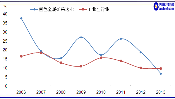 圖1 2006-2013年工業(yè)全行業(yè)及鐵礦業(yè)工業(yè)增加值增速情況 數(shù)據(jù)來源:中國統(tǒng)計(jì)局