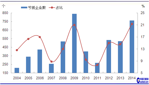 圖3 2004-2014年鐵礦采選業(yè)虧損企業(yè)數(shù)和占比變化走勢 數(shù)據(jù)來源:中國統(tǒng)計(jì)局