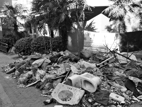 小區(qū)14號樓前樓梯口垃圾成堆:裝修廢渣、木板、鋼材塞滿垃圾桶,其中夾雜著各色生活垃圾,幾個廢棄的馬桶泛著扎眼的白光,還沒走近一股惡臭就撲面而來……