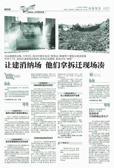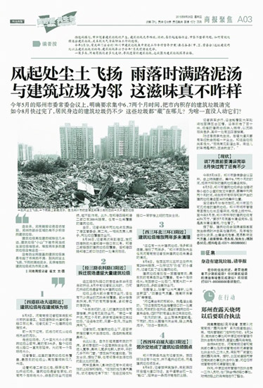 關于渣土車和建筑垃圾,《河南商報》一直都在關注。7月30日報道,《河南商報》曾曝光的3輛渣土車被“開除”出鄭州市場;8月26日至28日,《河南商報》刊發(fā)系列報道,關注鄭州市建筑垃圾問題。