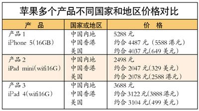 另外,剛剛上市的iPad mini,其wifi版的16G在美國市場僅為2047人民幣(329美元),大大低于中國內(nèi)地市場同款式的2498元人民幣。即使與前幾代價格沒有變化的ipad 4,其16G的wifi版在美國也只要3104元人民幣(499美元),中國香港市場為3122元人民幣(3888港元),而中國內(nèi)地市場卻要3688元人民幣。