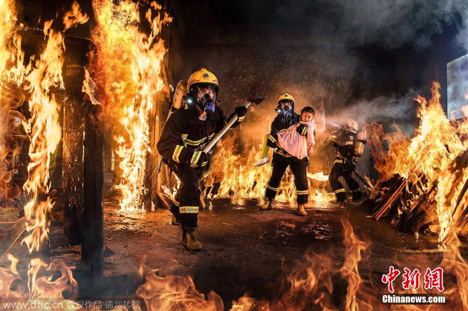 2014年11月6日,四川成都,“烈火中,他們展雄威,救人于危難,豪氣干云天”。當晚10時,11·9消防日即將到來,四川省消防總隊與成都商報聯(lián)合推出 “烈火雄心”系列海報式視覺大片,以情景再現(xiàn)的專業(yè)攝影手段,刻畫出消防官兵一個個真實的工作畫卷。整個系列海報由9幅照片組成,涵蓋了車禍救援、火場突圍、高樓救人等多個救援場景,海報中男消防員威武豪氣,女消防員英姿颯爽。“在119宣傳日,是想以一種更加直觀、形象的方式,還原消防員真實的生活工作狀態(tài)?!睋?jù)這組大片的主創(chuàng)人員介紹,這次的組圖拍攝,類型包括地震廢墟、車禍困人、高樓營救等各類場景,將更全面的向世人展示不同類型的消防員,以及他們在救援現(xiàn)場背后的感人瞬間,從各個層面展現(xiàn)出消防官兵他們奮不顧身、舍生忘死、一心為民的英雄本色。本組圖片中的角色,都是實實在在的消防員。每張海報的背后,都有著類似的救援故事,讓這些看似熟悉的場景,用海報大片的形式呈現(xiàn)給大家,將事實再現(xiàn)。圖片署名:成都商報-東方IC