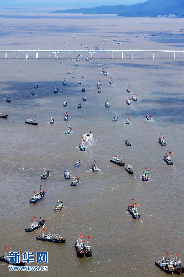 9月16日,浙江省舟山市沈家門漁港的漁船出港經(jīng)過朱家尖大橋開赴漁場(chǎng)。當(dāng)日,為期3個(gè)半月的東海伏季休漁結(jié)束,眾多漁船劈波斬浪,開往漁場(chǎng)。 新華社發(fā)(華志波 攝)