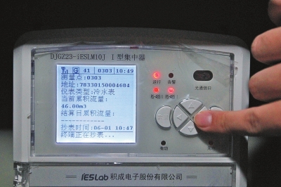 10時(shí)49分,在33樓的電井房?jī)?nèi),操作員正在調(diào)試集中器。記者看到,集中器的電子屏顯示最近一次抄表內(nèi)容為:10時(shí)47分,冷水表,當(dāng)前流量46立方米。