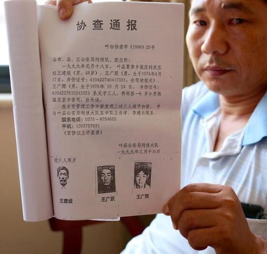 當(dāng)年被通緝的幾個(gè)人,被認(rèn)定嫌疑最大的王某躍至今未歸案。村民推斷,一個(gè)人較難完成殺人、埋尸、抬柜子掩藏。而且,葉縣警方信息顯示,王某躍患有精神疾病。不久后,公安局下發(fā)了協(xié)查通報(bào)稱,王某坡、王某躍、王某輝系父子三人,“將鄰居一6歲小男孩騙至家中害死,后外逃。”