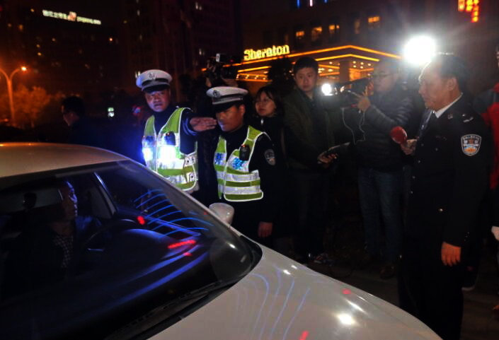 ▲11月16日晚,河南省公安廳交警總隊(duì)總隊(duì)長(zhǎng)馮國(guó)文(右一)帶隊(duì)查酒駕。
