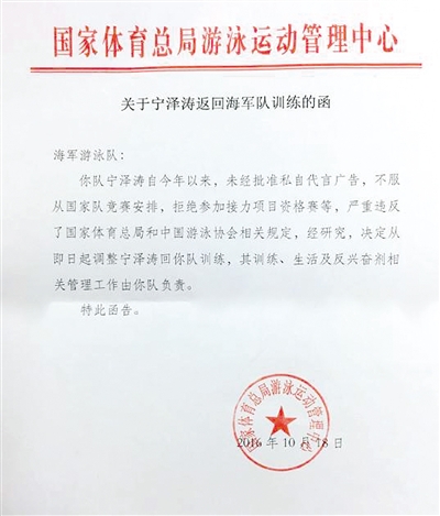 日前有媒體報(bào)道寧澤濤離隊(duì)的消息,并附有國(guó)家體育總局游泳運(yùn)動(dòng)管理中心內(nèi)部文件的照片,文件內(nèi)容為:“海軍游泳隊(duì):你隊(duì)寧澤濤今年以來(lái),未經(jīng)批準(zhǔn)私自代言廣告,不服從國(guó)家隊(duì)競(jìng)賽安排,拒絕參加接力項(xiàng)目資格賽,嚴(yán)重違反了國(guó)家體育總局和中國(guó)游泳協(xié)會(huì)相關(guān)規(guī)定,經(jīng)研究,決定從即日起調(diào)整寧澤濤回你隊(duì)訓(xùn)練,其訓(xùn)練、生活及反興奮劑相關(guān)管理工作由你隊(duì)負(fù)責(zé)。特此函告。”時(shí)間落款為2016年10月18日。
