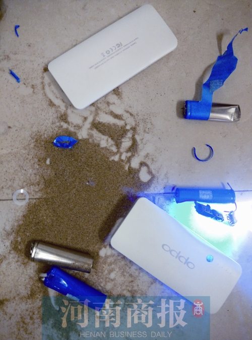 離開后,河南商報記者將充電寶拆開,看到充電寶中部分蓄電池與其他電池獨立分開,根本沒有導線,而沒有導線的電池里,裝滿了沙子。“oppo”充電寶中共有5節(jié)電池,有2節(jié)與電板通過導線相連,剩下光禿禿的3節(jié)電池“自成一派”。用錘子敲碎2節(jié),從電池里流出了細沙。