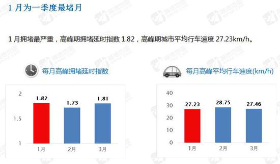 第一季度中,1月為一季度最堵月,鄭州市一季度有1天的出行時間是暢通下的2倍以上。