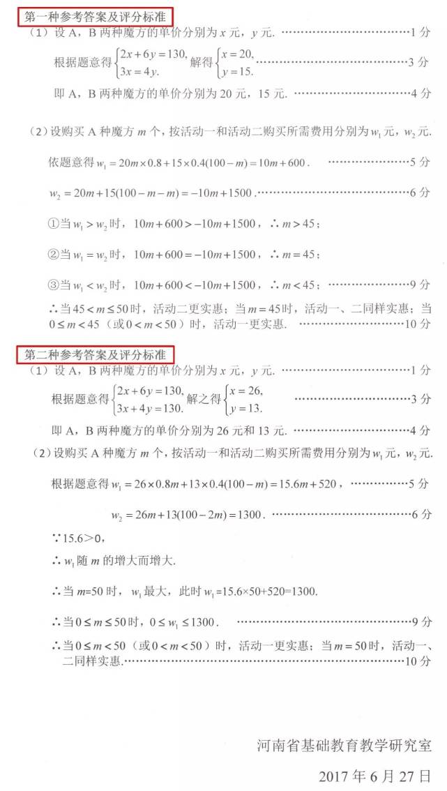 該題不存在科學(xué)性錯(cuò)誤,但在文字表述上不夠精準(zhǔn),致使部分考生產(chǎn)生不同理解。按照題目給定的條件,可以有兩種解法。除《二0一七年河南省普通高中招生考試試卷、參考答案及評(píng)分標(biāo)準(zhǔn)》給定的解法和答案外,還有另外一種解法和答案。兩種解法都能考查出同樣的數(shù)學(xué)思維和方法,且難度相當(dāng)。