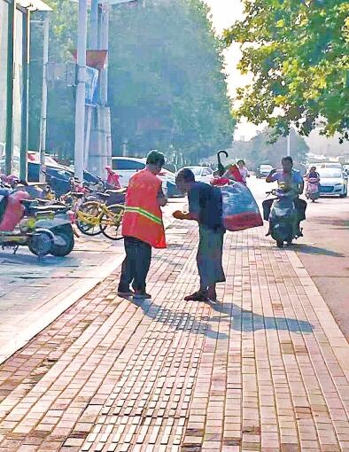 發(fā)生在鄭州金水路街頭的這一幕,剛好被市民拍到。昨日在網(wǎng)絡(luò)上發(fā)布后,感動了很多網(wǎng)友。62歲的女環(huán)衛(wèi)工事后說:“這是應(yīng)該的,是小事,不值得宣傳。”附近熟識她的人說,這名環(huán)衛(wèi)工是個熱心腸,之前已經(jīng)多次給流浪人員買飯、送水、送餐。