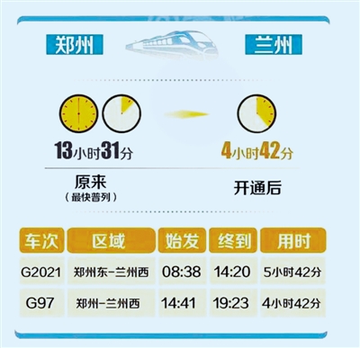 據(jù)鄭州東站工作人員介紹,即日起鄭州東站每天將有18趟往返蘭州的高鐵列車(具體列車車次、開行日期以12306網(wǎng)站以及車站公告為主),其中始發(fā)高鐵列車3趟。鄭州到蘭州最快的車次為G97,從鄭州車站至蘭州西站,中間經(jīng)停西安北、天水南站,全程僅需4小時42分。這較之前最快的Z265次列車足足縮短了將近8個小時。