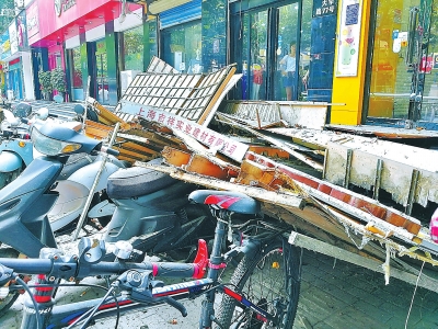 本報(bào)訊8月5日下午1時(shí)40分左右,鄭州市民李女士逛過大學(xué)路一家沿街服裝店,轉(zhuǎn)身剛剛離去,只聽見轟的一聲巨響,店鋪的門頭招牌墜落。約20平方米的門頭招牌,砸中了店前幾輛電動(dòng)車,幸未殃及行人。