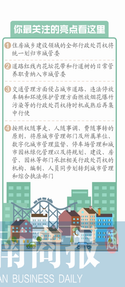 按照權(quán)隨事走、人隨事調(diào)、費(fèi)隨事轉(zhuǎn)的原則,將原城市管理部門(mén)及所屬單位、數(shù)字化城市管理監(jiān)督、停車(chē)場(chǎng)管理和城市園林綠化管理涉及的機(jī)構(gòu)、編制、人員同步劃轉(zhuǎn)到城市管理和綜合執(zhí)法部門(mén);將規(guī)劃、建設(shè)、房管、園林等部門(mén)承擔(dān)相關(guān)行政處罰權(quán)的機(jī)構(gòu)、編制、人員同步劃轉(zhuǎn)到城市管理和綜合執(zhí)法部門(mén)。