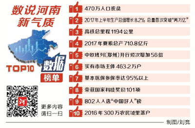 根據(jù)網(wǎng)友投票結(jié)果和專家評審意見,這份令人矚目的榜單最終揭開神秘“面紗”。其中,470萬人口脫貧、2017年上半年生產(chǎn)總值增長8.2%總量首次突破“兩萬億”和高鐵總里程1194公里名列前三位,2017年夏糧總產(chǎn)710.8億斤、中歐班列(鄭州)開行頻次增加56倍、實有市場主體463.2萬戶、基本醫(yī)保參保率達95%以上、榮獲國家科技獎勵101項、802人入選“中國好人”榜、2016年300萬農(nóng)民城里落戶等7個數(shù)據(jù)也榜上有名。