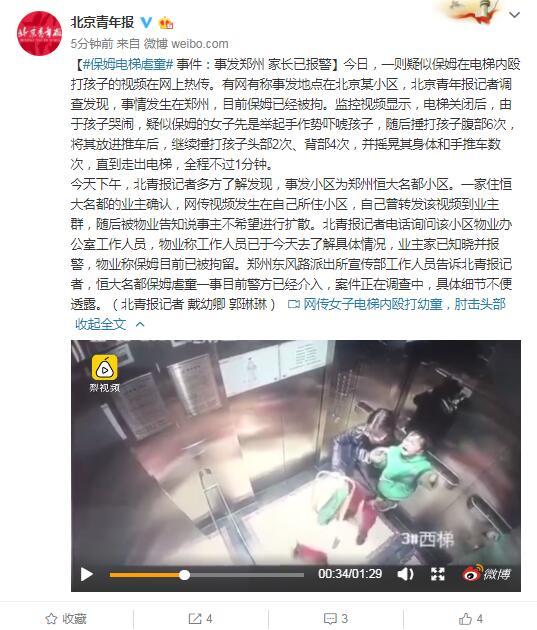 今日,一則疑似保姆在電梯內(nèi)毆打孩子的視頻在網(wǎng)上熱傳。有網(wǎng)有稱事發(fā)地點在北京某小區(qū),北京青年報記者調(diào)查發(fā)現(xiàn),事情發(fā)生在鄭州,目前保姆已經(jīng)被拘。監(jiān)控視頻顯示,電梯關(guān)閉后,由于孩子哭鬧,疑似保姆的女子先是舉起手作勢嚇唬孩子,隨后捶打孩子腹部6次,將其放進(jìn)推車后,繼續(xù)捶打孩子頭部2次、背部4次,并搖晃其身體和手推車數(shù)次,直到走出電梯,全程不過1分鐘。