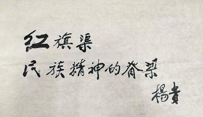 采訪結(jié)束時,楊老不顧身體勞累,為“大河報紀念紅旗渠通水50周年特刊”題寫刊名:“紅旗渠民族精神的脊梁”。