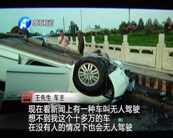 王先生說,當(dāng)時(shí)他將車停在路邊,準(zhǔn)備下車打電話,沒想到剛剛下車,車就自個(gè)兒跑了。汽車一路“狂飆”,王先生眼睜睜地看著自己的轎車撞向路中間的轉(zhuǎn)盤。