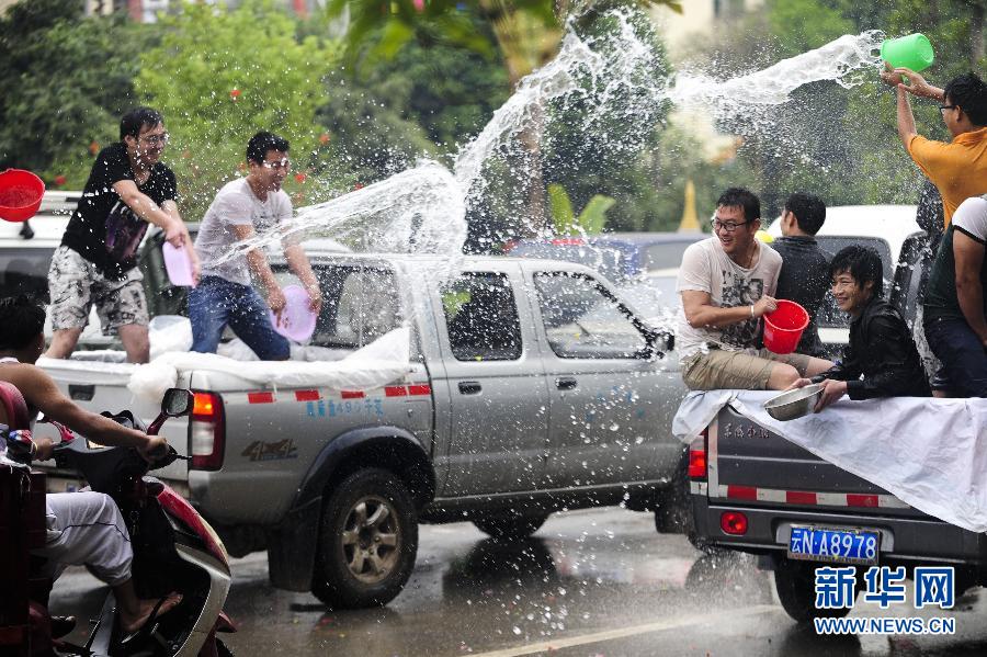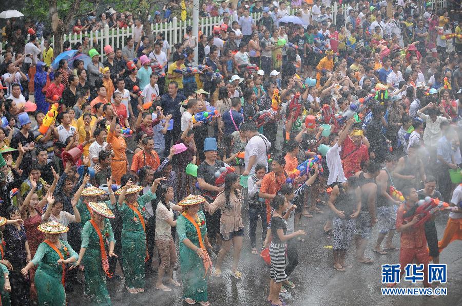 4月12日,人們?cè)诘潞昝⑹袕V場上體驗(yàn)潑水狂歡。當(dāng)日,云南省德宏傣族景頗族自治州繼續(xù)舉行2013年國際潑水狂歡節(jié),各族群眾和游客歡聚在德宏芒市廣場狂歡潑水,祈福吉祥平安。 新華社記者秦朗 攝