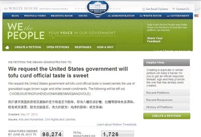 “我們請(qǐng)求美國(guó)政府取締北京煎餅果子!”9日,美國(guó)白宮供民眾向政府表達(dá)意愿的請(qǐng)?jiān)妇W(wǎng)站“我們?nèi)嗣瘛背霈F(xiàn)了這樣一則中文“請(qǐng)?jiān)浮眱?nèi)容。最近幾天來,該網(wǎng)站多次出現(xiàn)疑來自華人的請(qǐng)?jiān)?,不少?nèi)容很無厘頭。