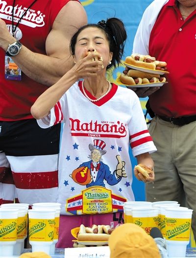7月4日,紐約舉行吃熱狗大賽,參賽選手正大嚼熱狗。吃熱狗競賽是紐約康尼島慶祝獨立日的一項傳統(tǒng)趣味活動。新華社發(fā)