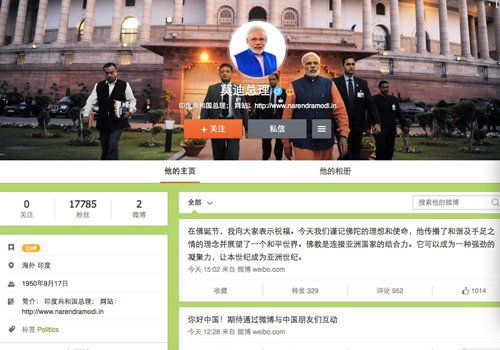 據(jù)媒體報(bào)道,莫迪計(jì)劃于本月訪問(wèn)中國(guó)。他也成為又一位開(kāi)展“微博外交”的外國(guó)國(guó)家領(lǐng)導(dǎo)人。此前,已經(jīng)有4個(gè)國(guó)家的領(lǐng)導(dǎo)人開(kāi)通了新浪微博,其中澳大利亞前總理陸克文是第一位,委內(nèi)瑞拉總統(tǒng)尼古拉斯·馬杜羅和英國(guó)首相卡梅倫均在2013年開(kāi)了微博,以色列前總統(tǒng)西蒙·佩雷斯于2014年開(kāi)通。