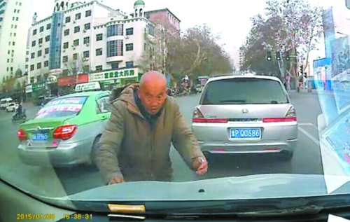 “那乞丐攔到本田車前,司機不敢硬闖。”趙先生說,后方車輛不停鳴笛,僵持了1分20秒后,老人拿到錢,轉向別的車輛,此時路口已變成了紅燈。
