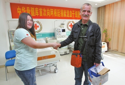 4月18日14時44分,黃發(fā)碧眼的志愿者喬治(英文全名:GeorgesJeanMarianelli),走進河南省腫瘤醫(yī)院造血干細(xì)胞采集室,徑直走到病床邊,向正躺在病床上采集造血干細(xì)胞的河南姑娘武佳微笑示意,走上前去說“你好”,并為她豎起大拇指。幾分鐘后,病床邊的造血干細(xì)胞采集機停止運轉(zhuǎn),這位26歲的河南姑娘捐獻(xiàn)的199毫升造血干細(xì)胞混懸液,被醫(yī)護人員小心翼翼地取下……這份飽含河南大愛的“生命種子”,將搭乘飛機,輾轉(zhuǎn)被送到萬里之外的阿根廷,為一名8歲白人兒童送去生命希望。