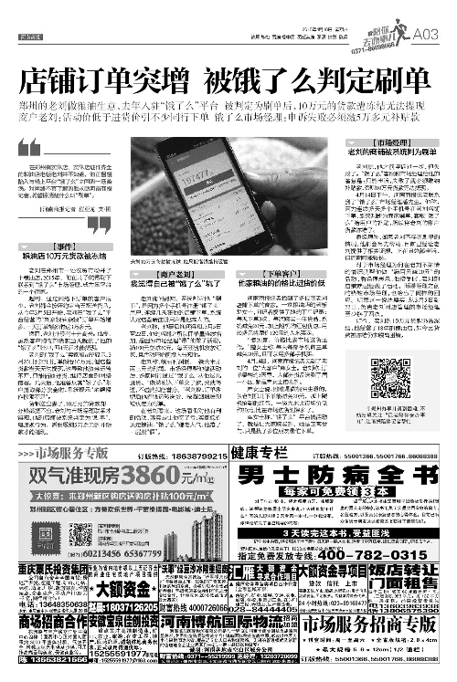 4月16日,《河南商報》以《店鋪訂單突增 被餓了么判定刷單》為題,對老劉10萬多元的交易款被凍結(jié)一事進行報道,“餓了么”市場經(jīng)理潘先生稱,因為連續(xù)多天多個手機號在老劉店鋪下單,系統(tǒng)判斷為商家刷單,套取“餓了么”給用戶的補貼,所以將老劉的賬戶貨款凍結(jié)了。