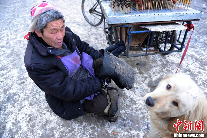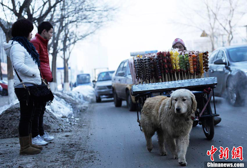 2月6日,在長(zhǎng)春市一條繁華的街路上,一只小狗幫助身殘主人拉車賣冰糖葫蘆,成為長(zhǎng)春冬日街頭一道感人的風(fēng)景線。據(jù)主人介紹,雖然自己身殘且貧窮,但并不想靠別人救濟(jì)度日,因此學(xué)會(huì)了制作冰糖葫蘆的手藝,并以此自食其力。而他養(yǎng)的這條小狗“大黃”也是對(duì)主人不離不棄,每日都會(huì)幫助主人拉車外出謀生。張瑤 攝