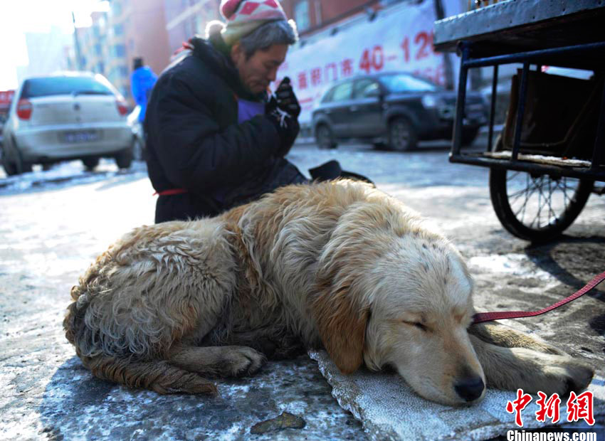 2月6日,在長(zhǎng)春市一條繁華的街路上,一只小狗幫助身殘主人拉車賣冰糖葫蘆,成為長(zhǎng)春冬日街頭一道感人的風(fēng)景線。據(jù)主人介紹,雖然自己身殘且貧窮,但并不想靠別人救濟(jì)度日,因此學(xué)會(huì)了制作冰糖葫蘆的手藝,并以此自食其力。而他養(yǎng)的這條小狗“大黃”也是對(duì)主人不離不棄,每日都會(huì)幫助主人拉車外出謀生。圖為主人走累了抽根煙歇息的時(shí)候,小狗也在旁邊小憩一下。張瑤 攝