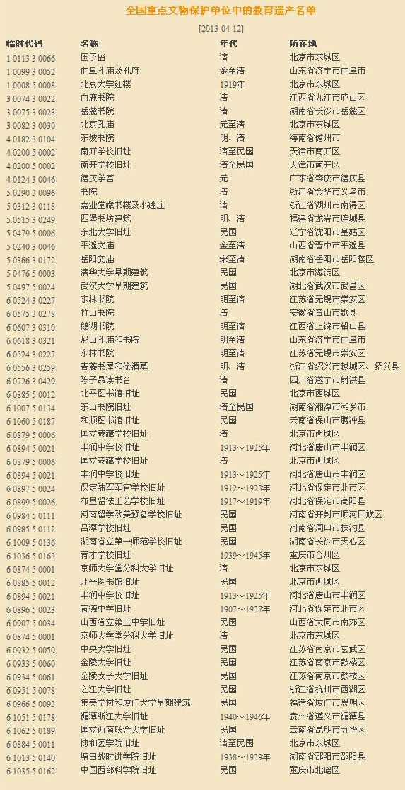 我國(guó)作為歷史悠久的文明古國(guó),教育的傳統(tǒng)源遠(yuǎn)流長(zhǎng),春秋私學(xué)即興;此后官學(xué)、私學(xué)交織發(fā)展,在歷史上形成“學(xué)校如林、庠序盈門”的景象,給后世留下了極為豐富的教育遺產(chǎn)。僅在國(guó)務(wù)院批準(zhǔn)的全國(guó)重點(diǎn)文物保護(hù)單位當(dāng)中,就有 “國(guó)子監(jiān)”“孔廟”“白鹿書院”“岳麓書院”“北京大學(xué)紅樓”等相關(guān)教育遺產(chǎn)六十余處。它們不僅具有文物建筑本身的歷史、科學(xué)、美術(shù)、文化等各方面的價(jià)值,而且承載、見證了中華民族優(yōu)秀的文化教育傳統(tǒng),促進(jìn)了各個(gè)時(shí)代的精神文化建設(shè)。因此,提出并深入研究教育的遺產(chǎn),不僅有利于豐富歷史文化遺產(chǎn)的內(nèi)容,而且有利于進(jìn)一步細(xì)分文化遺產(chǎn)類型、豐富世界文化遺產(chǎn)的多樣性。