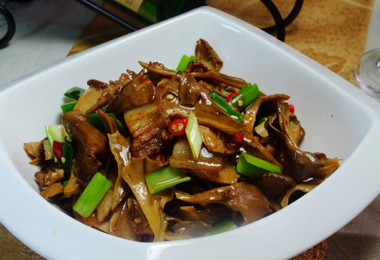 青松翠柏牛肝菌是用昆明特有的虎皮青椒,也就是云椒烹制的,肉厚味清香。在牛肝菌過油變色后立即加入云椒塊,大火爆炒,換小火加適量鹽即可出鍋。幾乎沒有其他調(diào)味料,純粹考驗食材的鮮香本味——醬香和清香相輔相成,天然去雕飾。