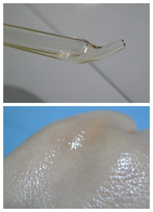 肌膚清潔之后,開始使用彼得羅夫維他命A晚間滋養(yǎng)精華液。PTR小藍瓶是水狀油質的透明無味液體,滴在手背上極易擴散,說明它的流動性很強。稍加按摩,精華液便被完全吸收,滋潤但不黏膩,讓肌膚很有好感。